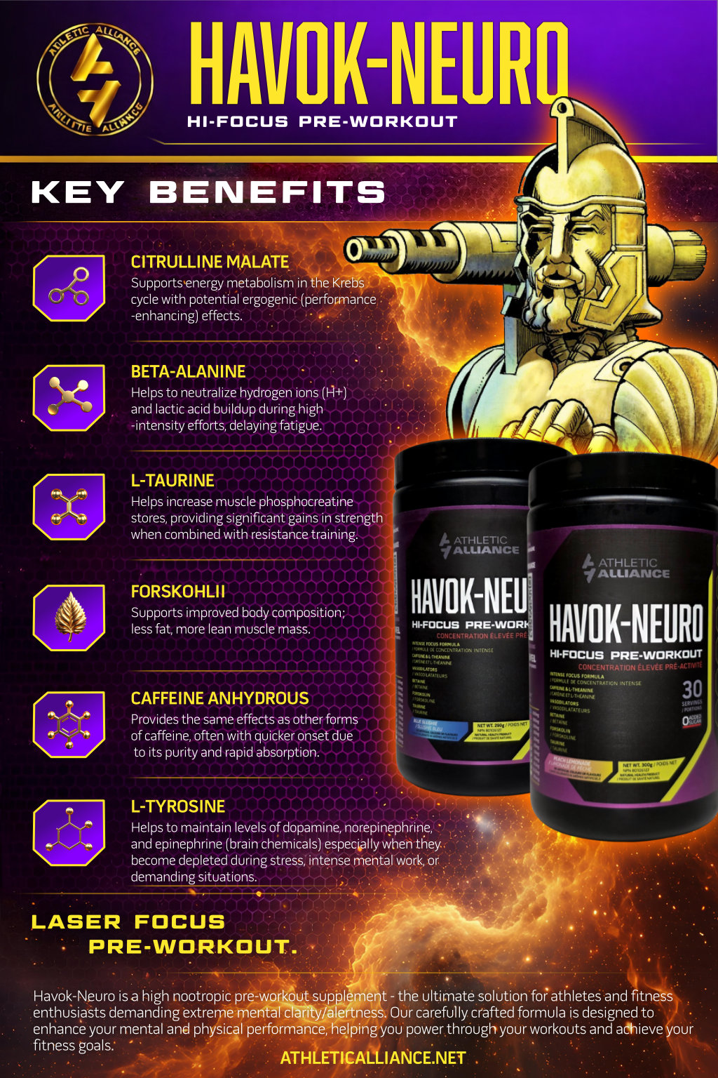 Havok-Neuro is a high nootropic pre-workout supplement - the ultimate solution for athletes and fitness enthusiasts demanding extreme mental clarity/alertness. Our carefully crafted formula is designed to enhance your mental and physical performance, helping you power through your workouts and achieve your fitness goals.
