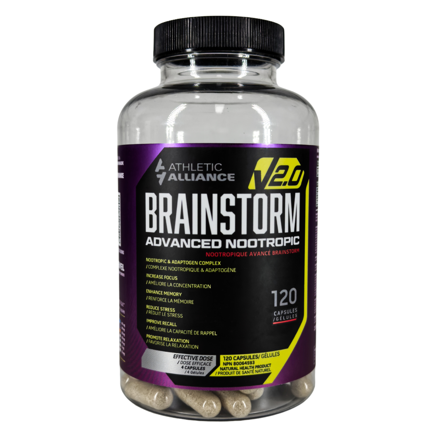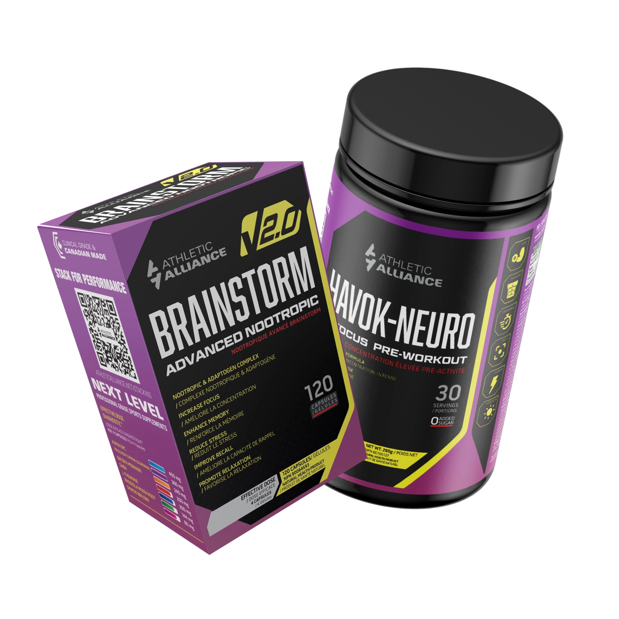Brainstorm Advanced Nootropic complements this perfectly as a daily cognitive foundation, featuring Bacopa Monnieri, Ginkgo Biloba, Alpha-GPC, GABA, Huperzine A, L-Theanine, Rhodiola Rosea, and Guarana. These ingredients target long-term memory retention, creativity, reasoning, stress resilience, and sustained mental alertness without overstimulation—Alpha-GPC and Huperzine A boost acetylcholine production and retention for sharper recall and learning, while Bacopa, Ginkgo, and Rhodiola support brain health, reduce anxiety, and improve overall cognitive stamina. Athletic Alliance even markets them together as the “Ultimate Energy and Focus Stack,” because the shared nootropics (Alpha-GPC, Huperzine A, L-Theanine) amplify each other for greater acetylcholine signaling and smooth focus, while Havok-Neuro’s acute physical and stimulant-driven edge pairs with Brainstorm’s baseline memory, reflex, and mood support. The result is comprehensive coverage: immediate workout performance and mental lockdown from Havok-Neuro, layered with all-day cognitive enhancement, better recovery from stress, and improved storage/retrieval from Brainstorm—ideal for athletes chasing both peak physical output and superior mental performance.