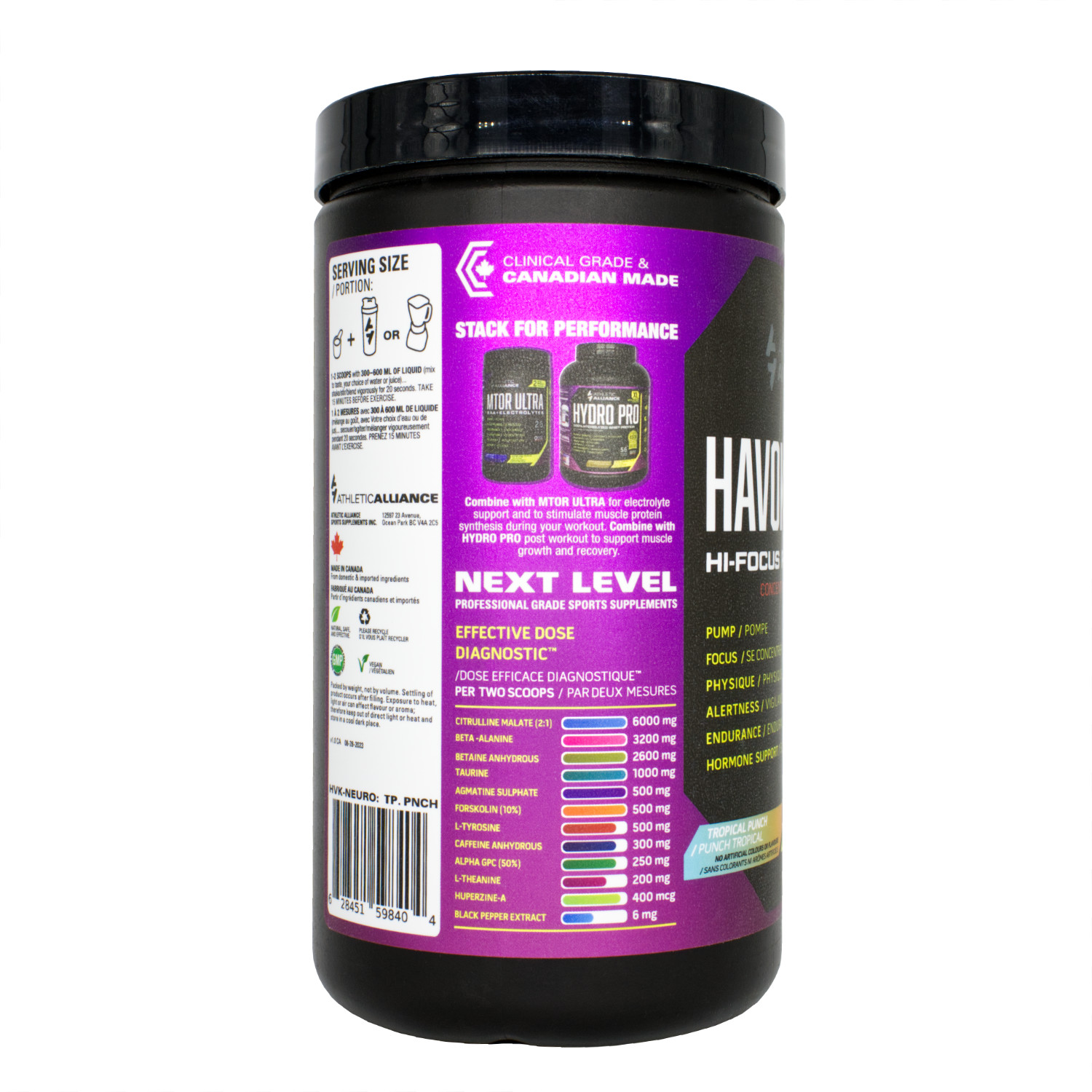 Havok-Neuro from Athletic Alliance is a high-powered pre-workout loaded with performance and nootropic ingredients like Citrulline Malate, Agmatine Sulfate, Beta-Alanine, Betaine Anhydrous, Taurine, L-Tyrosine, Forskolin, Caffeine, L-Theanine, Alpha-GPC, and Huperzine A. It delivers explosive physical benefits such as enhanced blood flow, muscular endurance, reduced fatigue, and a sustained pump, while its elevated nootropic profile sharpens acute focus, mental clarity, mood elevation, and mind-muscle connection—creating that “locked-in” zone where everything feels like it’s moving in slow motion. Designed for cognitively demanding sessions, whether in the gym, on the field, or during e-gaming, it provides controlled energy that avoids the crash thanks to synergistic pairings like Caffeine + L-Theanine.